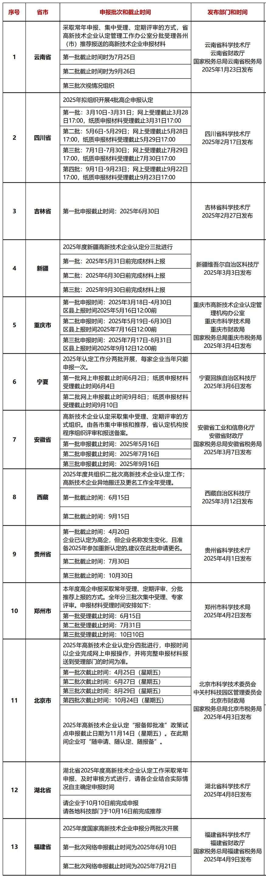 安徽省:第一批截止时间:2025年5月16日;第二批申报截止时间:2025年7月16日;第三批申报截止时间:2025年9月16日