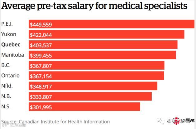 加拿大卫生信息中心 (Canadian Institute for Health Information) 统计的数据还显示,加拿大各省中,爱德华王子岛省 PEI 的专科医生收入排第一:人均年收入44万9000加元。