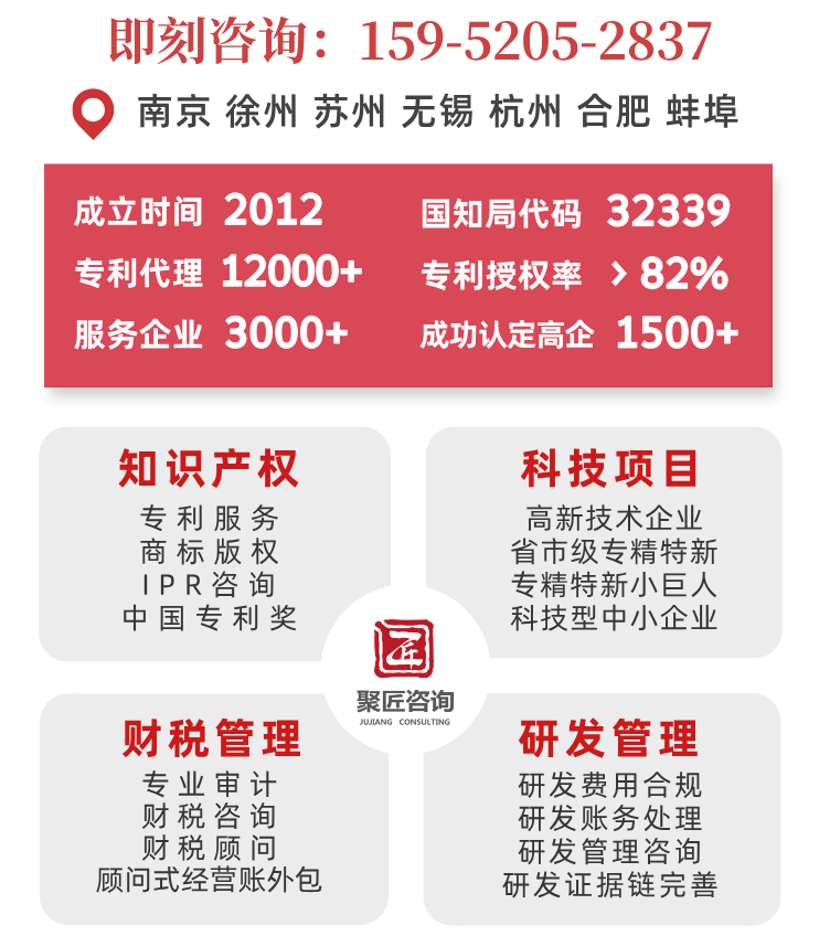 不过政策细节多,比如知识产权申请,研发费用归集,自己摸索容易踩坑。找懂政策的专业机构,省时间省精力,成功率高!聚匠深耕知识产权,项目申报10余年,国知局代码 32339 ,成功培育超2000家高企,代理专利超 12000 件。如果您有任何需求,欢迎直接联系我们,我们将为您提供 “知识产权+ 项目申报 +财税” 一站式解决方案。