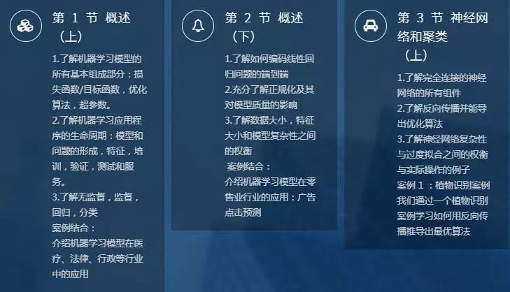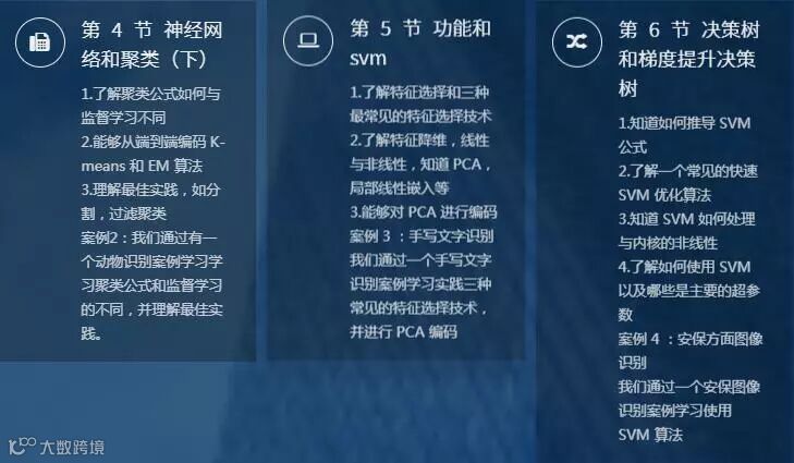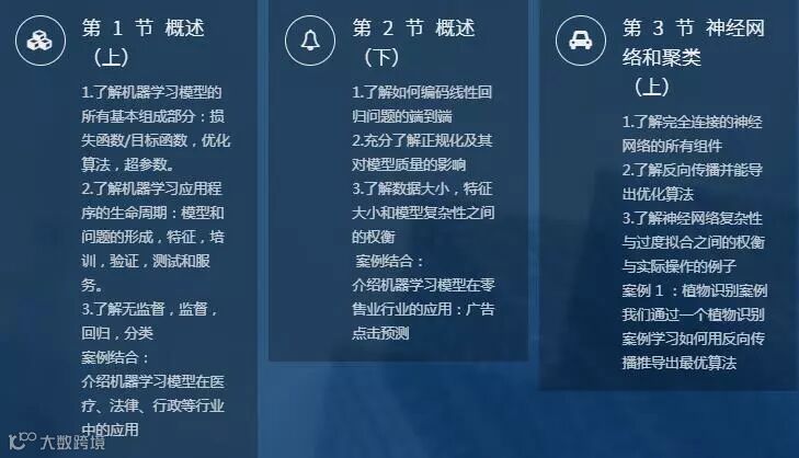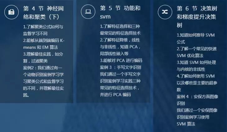 课程内容分为三个部分,从浅入深,循序渐进,且独立成篇。每部分约32小时时长,约由8小节组成;