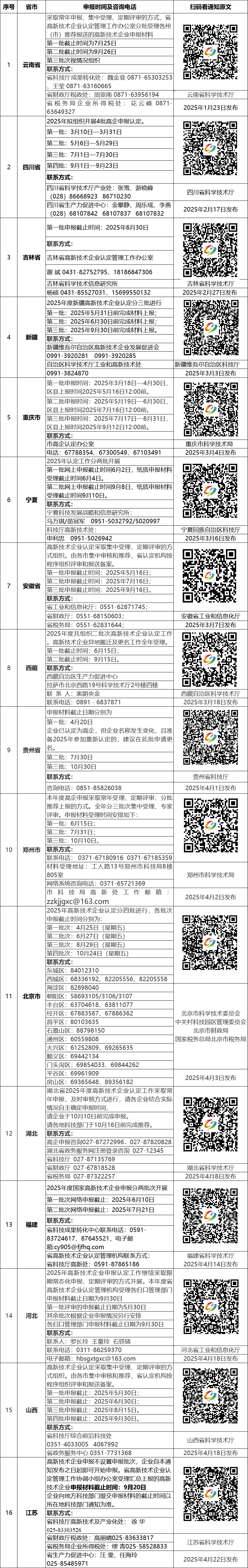 截止到目前,江苏、安徽、浙江、云南、四川、吉林、新疆、重庆、宁夏、贵州、郑州、北京、湖北、福建、河北、山西等众多省市已发布通知,明确了2025年高新技术企业认定与管理有关事项。