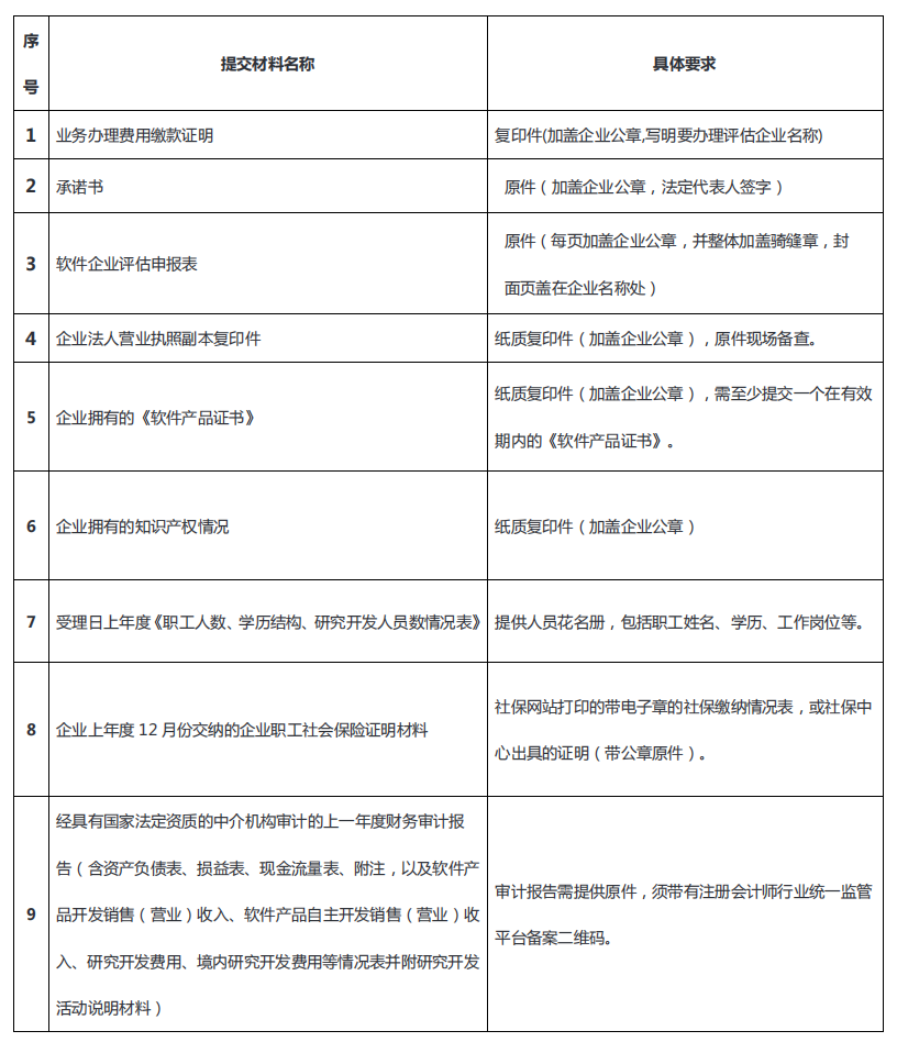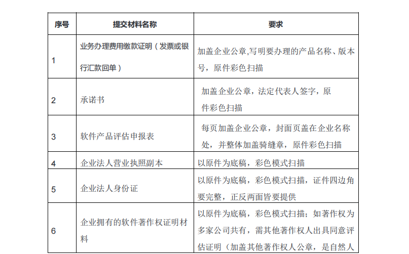(2)软件产品评估申请所需提交的材料及要求如下表
