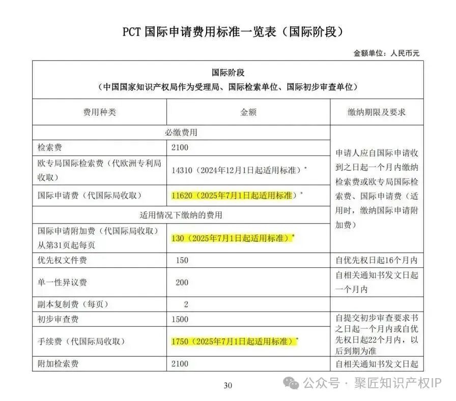 向国家知识产权局提交且收到日在2025年7月1日(含当日)之后的PCT申请的国际申请费,以及收到日在2025年7月1日(含当日)之后的PCT国际初步审查要求的手续费,适用本标准。
