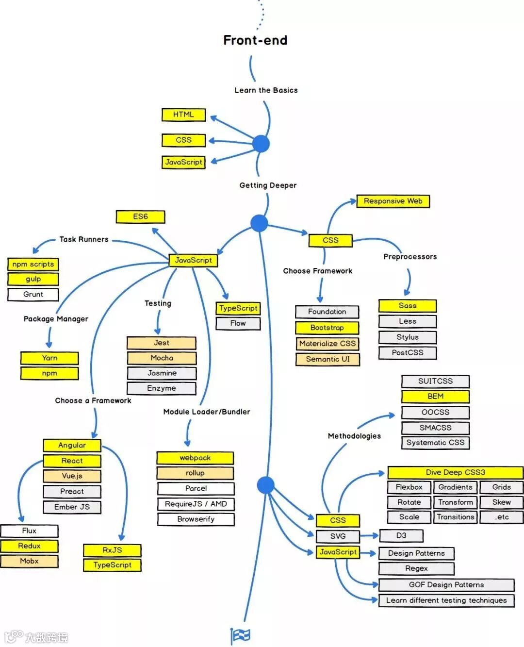 这是一组使用 Balsamiq 建造的网络开发者的路线图,如前端路线图如下: