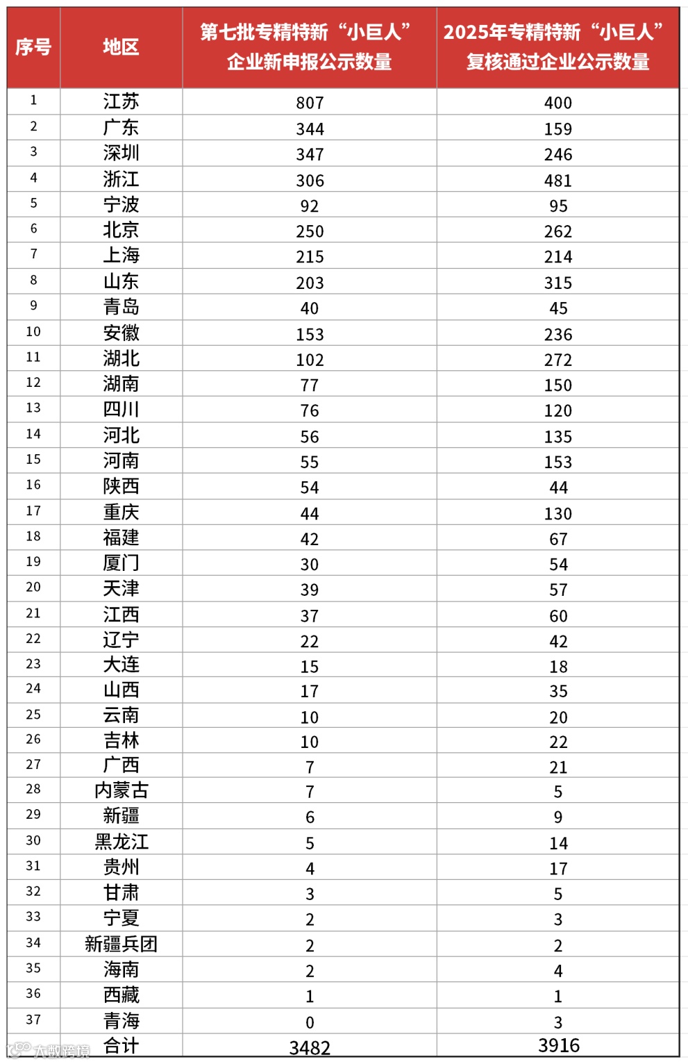 10月20日,全国参与统计的37个单位(省、直辖市、自治区、计划单列市、兵团)均按照公示的节奏发布了第七批专精特新“小巨人”企业名单,合计总数3482家,2025“小巨人”复核通过企业公示名单3916家”(不含未公示企业)。