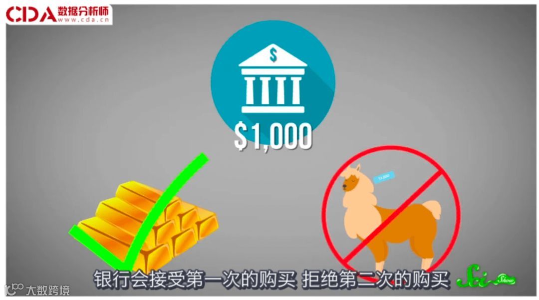 假设你在银行账号中有一千美元,你想买两个均为一千美元的物品。银行会接受第一次的购买,拒绝第二次的购买。