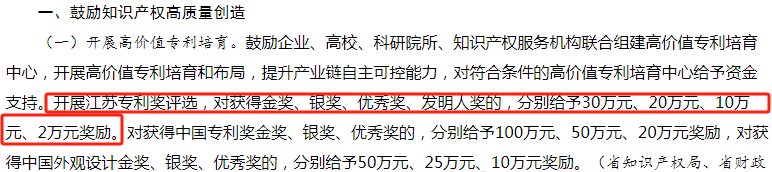 根据《江苏专利奖评奖办法》,对获得江苏专利金奖、银奖、优秀奖、专利发明人奖给予每项30万元、20万元、10万元、2万元的奖励。对获得中国专利奖金奖、银奖、优秀奖的,分别给予100万元、50万元、20万元奖励。