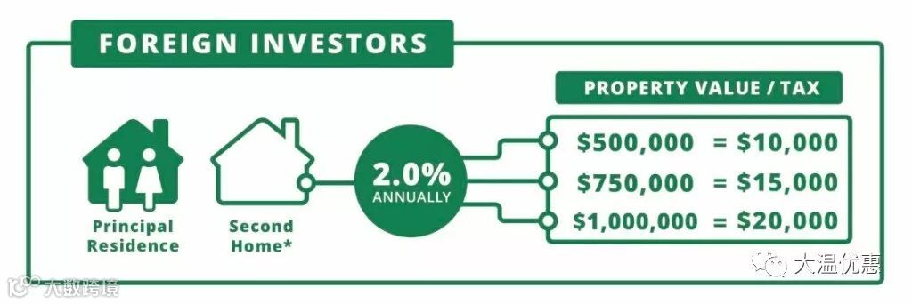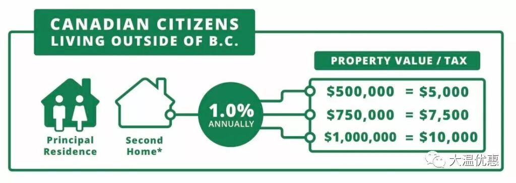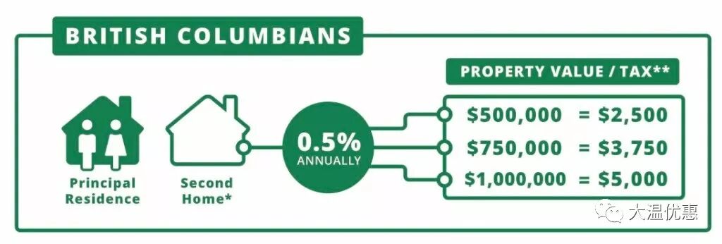 BC省居民需缴纳2018年房屋评估价值的0.5%,BC省以外的加拿大居民征收房产估值的1%,外国投资者征收2%。