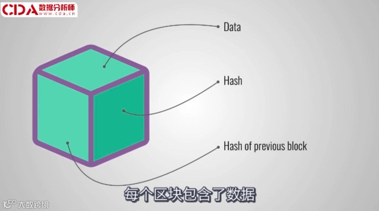 让我们仔细看看区块(block)。每个区块包含了数据,该区块的哈希值以及前一个区块的哈希值。
