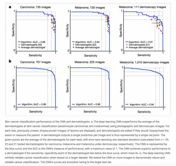 今年人工智能在医学领域最重大的,或者说最知名的突破来自斯坦福大学,该校的人工智能团队开发的算法在识别皮肤癌方面的准确性能够达到皮肤学专家的水平。有兴趣的读者可以查看这篇发表在《自然》杂志上的论文。