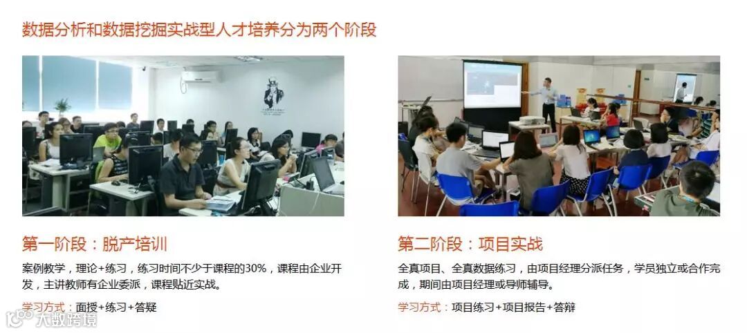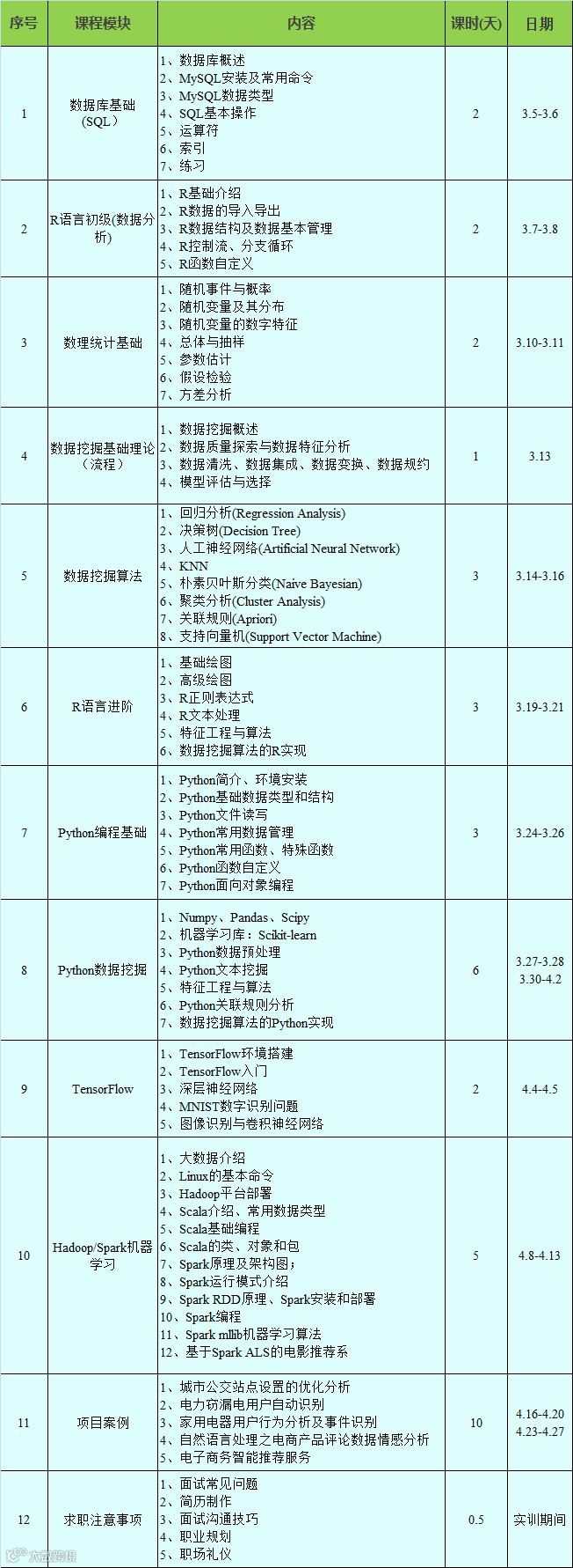 • 8周培训,4周项目实训,系统学习数据分析和数据挖掘方法和工具,掌握泛编程技术;