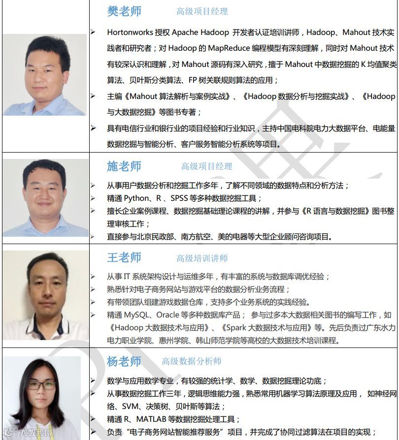 掌握主流数据挖掘工具R/Python/Scala和数据挖掘平台Hadoop/Spark/Tensorflow,具备工程实施能力要求;