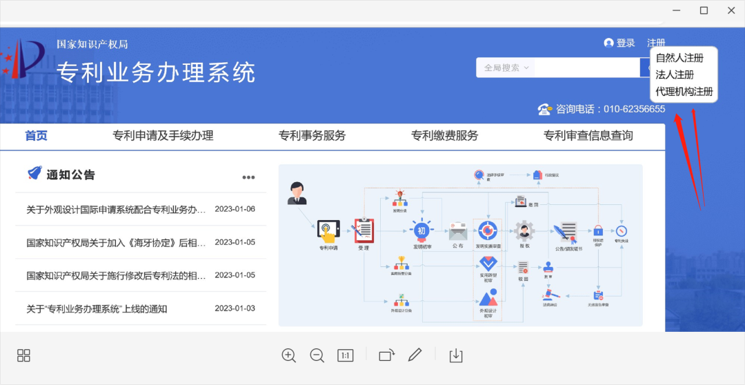 根据申请人主体类型选择注册通道,见下图箭头处。
