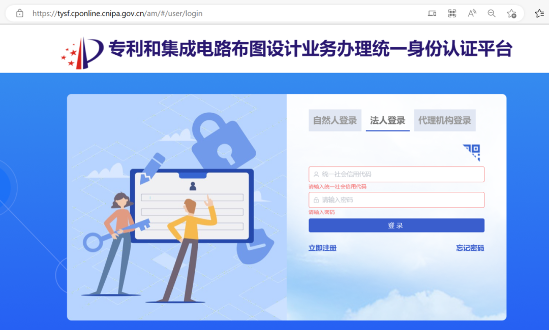 1 登录专利业务办理平台,勾选法人登录,填写统一信用代码及密码登录。https://tysf.cponline.cnipa.gov.cn/am/#/user/login