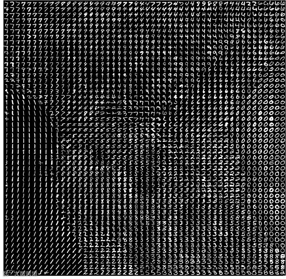 图像:混合使用t-SNE和Jonker-Volgenant算法得到的MNIST数据库的可视化结果。T-SNE是一种广泛使用的降维算法,通过压缩数据的表达来得到更好的可视化和进一步处理。