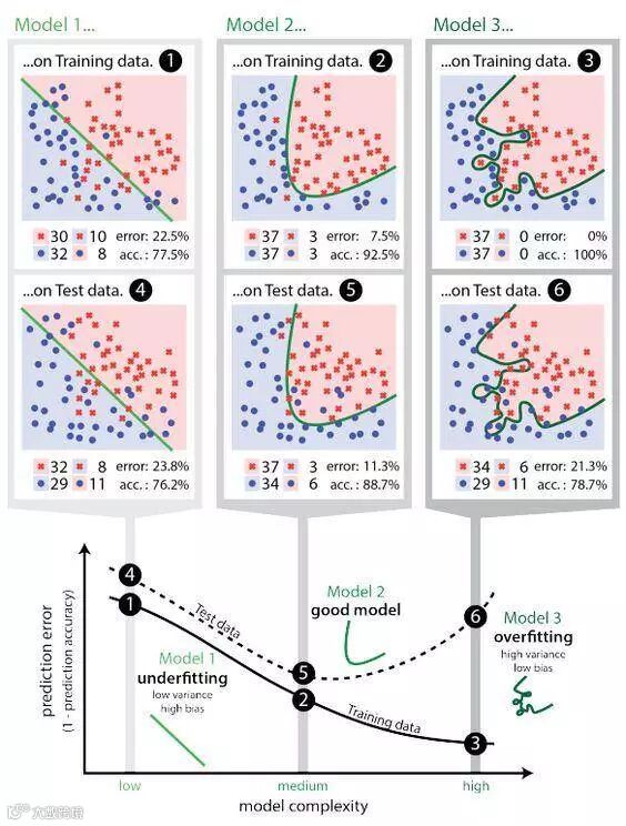 当过拟合现象发生,它通常意味着模型将随机噪声当作数据,并作为一个重要的信号去拟合它,这就是为什么模型在新数据上的表现会出现退化(噪声也有差异)。这在一些非常复杂的模型如神经网络或加速梯度模型上是很常见的。
