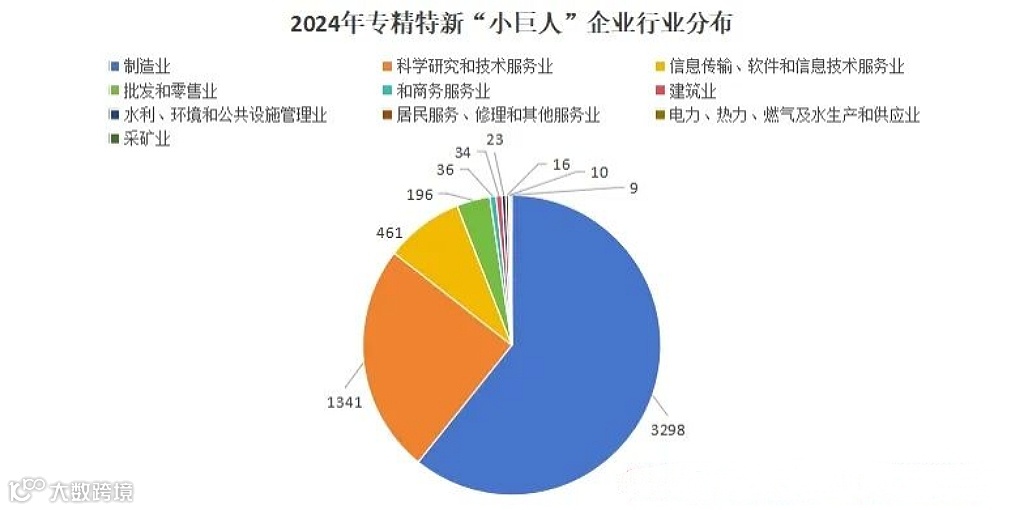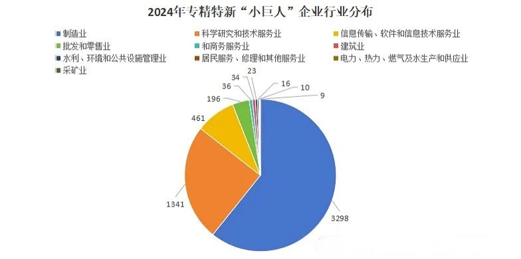 从2024第六批专精特新小巨人数据来看,专精特新“小巨人”企业集中分布在制造业。在专精特新“小巨人”企业分布前十的行业中,有9个行业属于制造业领域,其中计算机、通信和电子设备制造业、专用和通用设备制造业等行业是“小巨人企业密集度最高的行业
