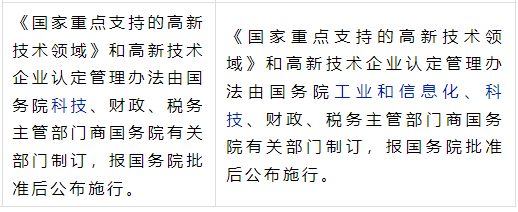 日前,《国务院关于修改和废止部分行政法规的决定》公布,自2025年1月20日起施行。《决定》第三条将《中华人民共和国企业所得税法实施条例》第九十三条第二款中的“科技”修改为“工业和信息化、科技”。修改后《国家重点支持的高新技术领域》和高新技术企业认定管理办法由工业和信息化、科技、财政、税务主管部门商国务院有关部门制订,报国务院批准后公布施行。