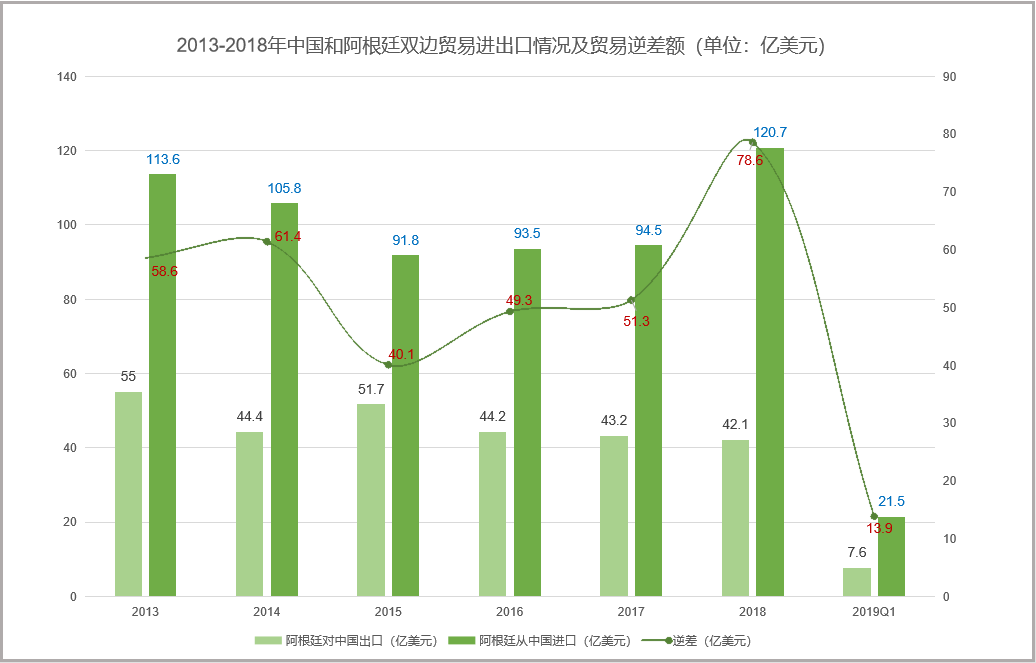 据阿根廷统计局统计数据来看,2013-2018年阿根廷从中方的进口额都大于出口额,阿根廷处于贸易逆差状态,并且中国是阿根廷最大的贸易逆差来源国;2018年阿根廷从中国进口额达到历史峰值,120.7亿美元;逆差额也达到历史最高值,约78.6亿美元。
