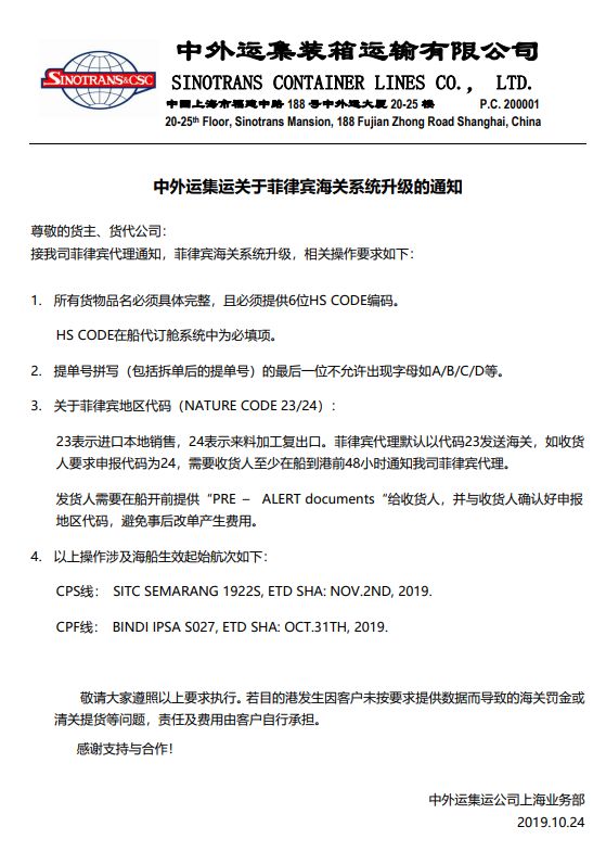 近期,菲律宾升级了海关系统,对进口货物HS CODE编码,提单号、地区代码(NATURE CODE 23/24)均作出新规定,违者将影响清关、产生罚金。