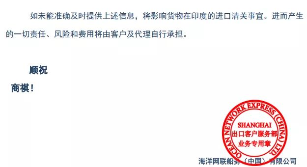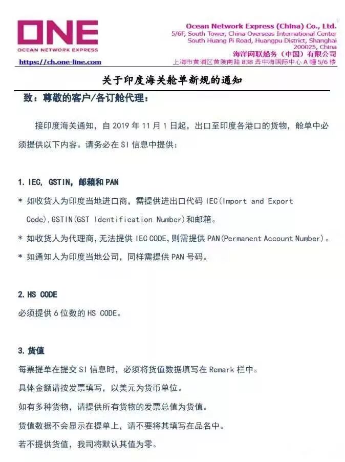接印度海关通知,自 2019年11月1日起,出口至印度各港口的货物,舱单中必须提供以下内容。请务必在 SI 信息中提供: