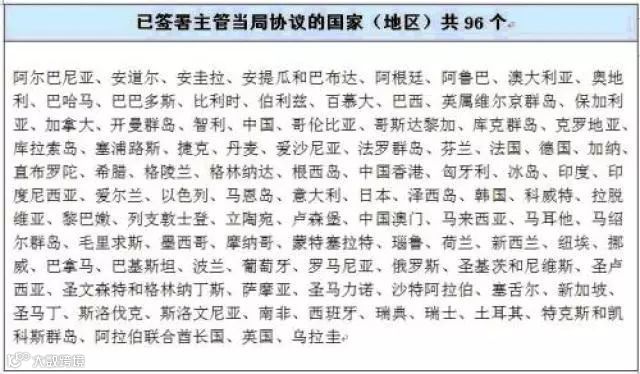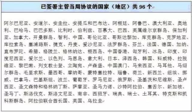 最新公开资料显示,截至2018年8月7日,已有103个国家(地区)签署了相关主管当局间协议,有巴西、英国、意大利、哥伦比亚、瑞士、土耳其、阿根廷等。