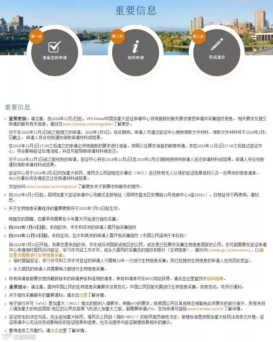 请注意,自2018年11月2日起,VFS Global中国加拿大签证申请中心将根据新的服务要求接受申请并採集指纹资讯。 相关要求及提交申请的服务有关资讯,请流览请流览www.Canada.ca/Immigration瞭解更多瞭解更多。。。