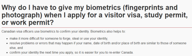 加拿大政府表示,收集指纹是为了管理申请者的身份,简化申请流程,协助合法旅客入境。收集指纹有助于阻止危险人士入境。 全球超过70个国家的移民部门都采用这项技术。