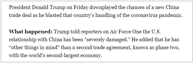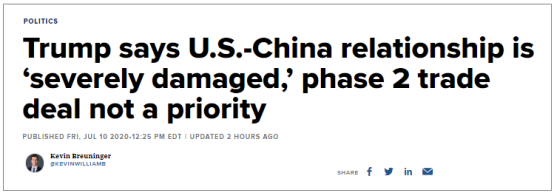 据美国《华尔街日报》网站7月10日报道,特朗普表示现在不考虑中美第二阶段经贸协议了,因为新冠病毒正在美国各地快速蔓延,两国关系因疫情而受到严重损害。