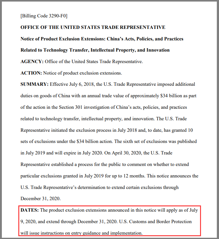 通知决定将排除有效期自2020年7月9日起延长至2020年12月31日。