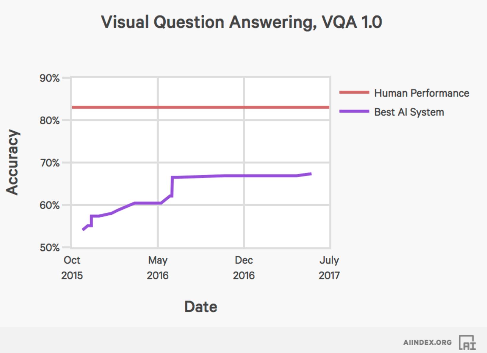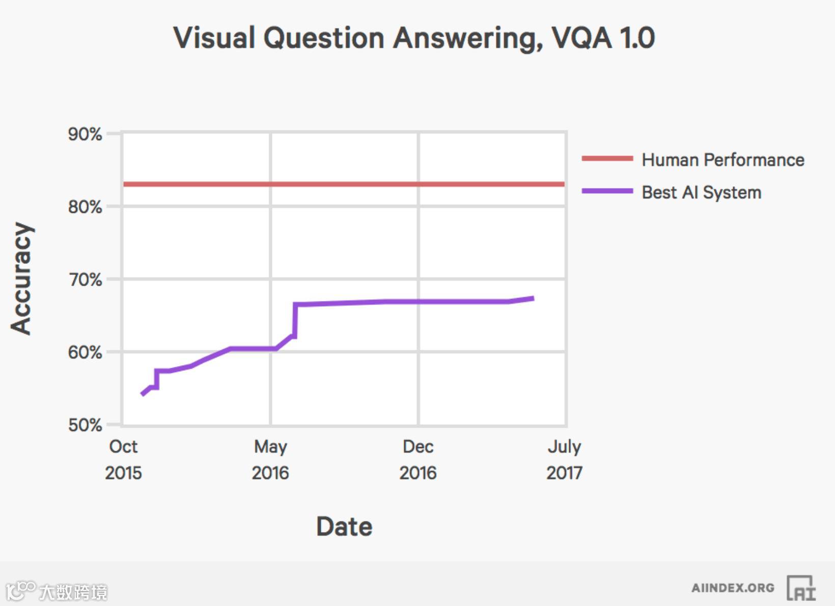 视觉问答(Visual Question Answering),是一种涉及计算机视觉和自然语言处理的学习任务。以下为在开放式回答有关图像问题的任务中,AI 系统的性能。