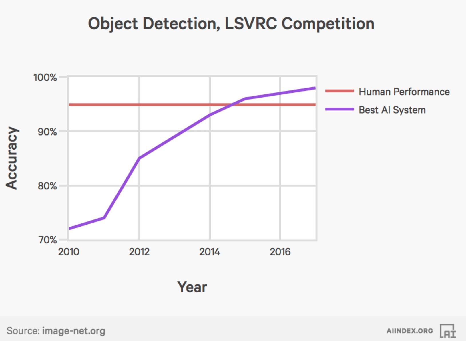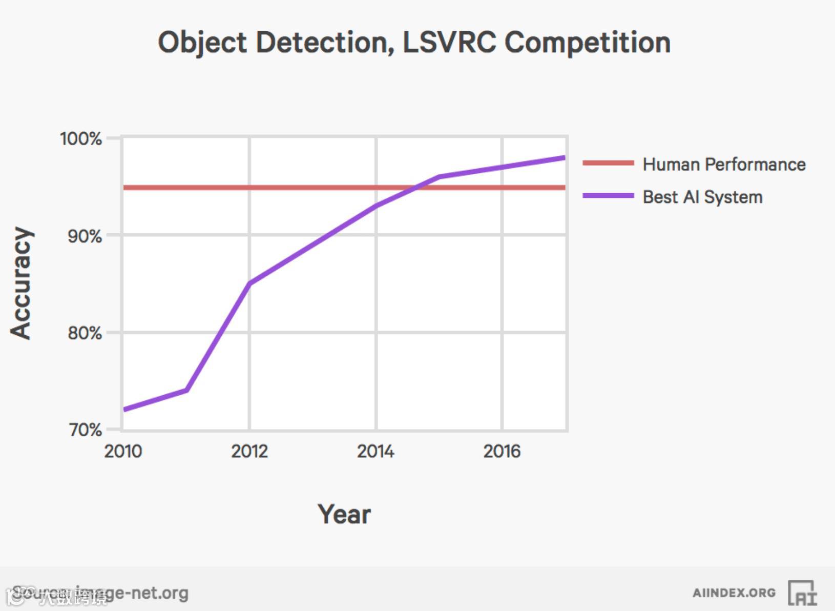 大型视觉识别挑战(LSVRC)比赛中,AI 系统检测物体的性能也在显著提升。自 2010 年以来,错误率从 28.5 %下降到低于 2.5% 。