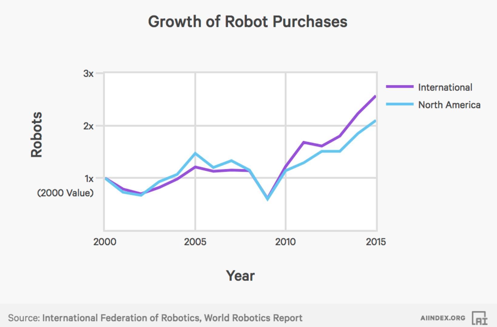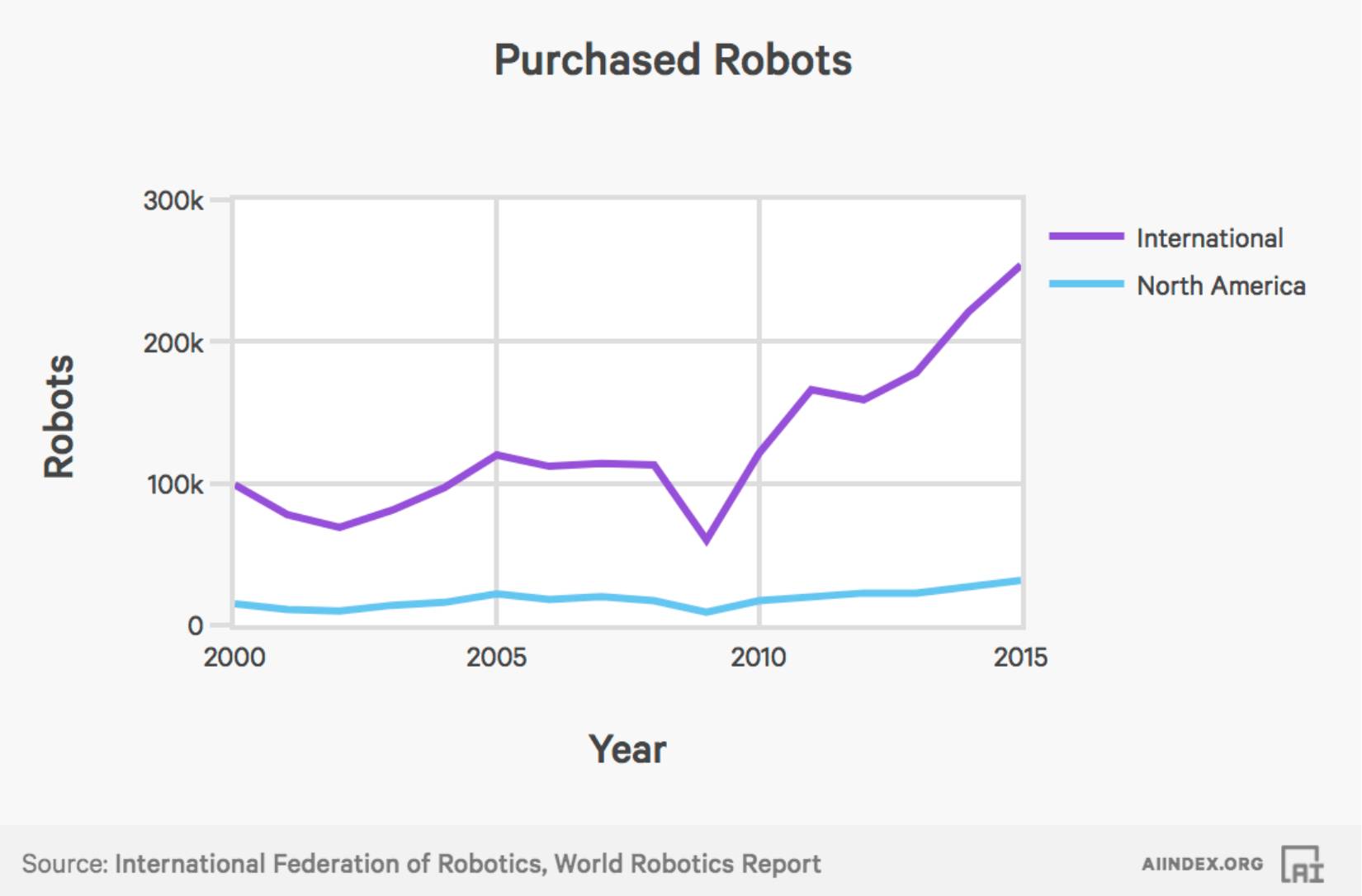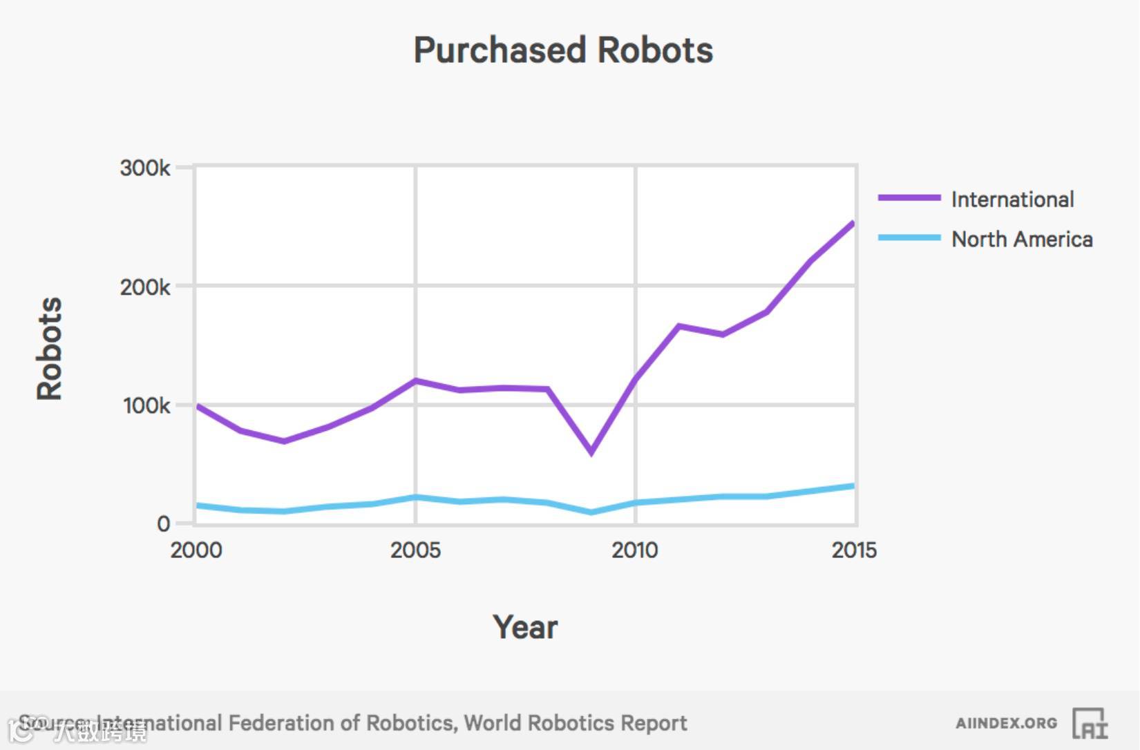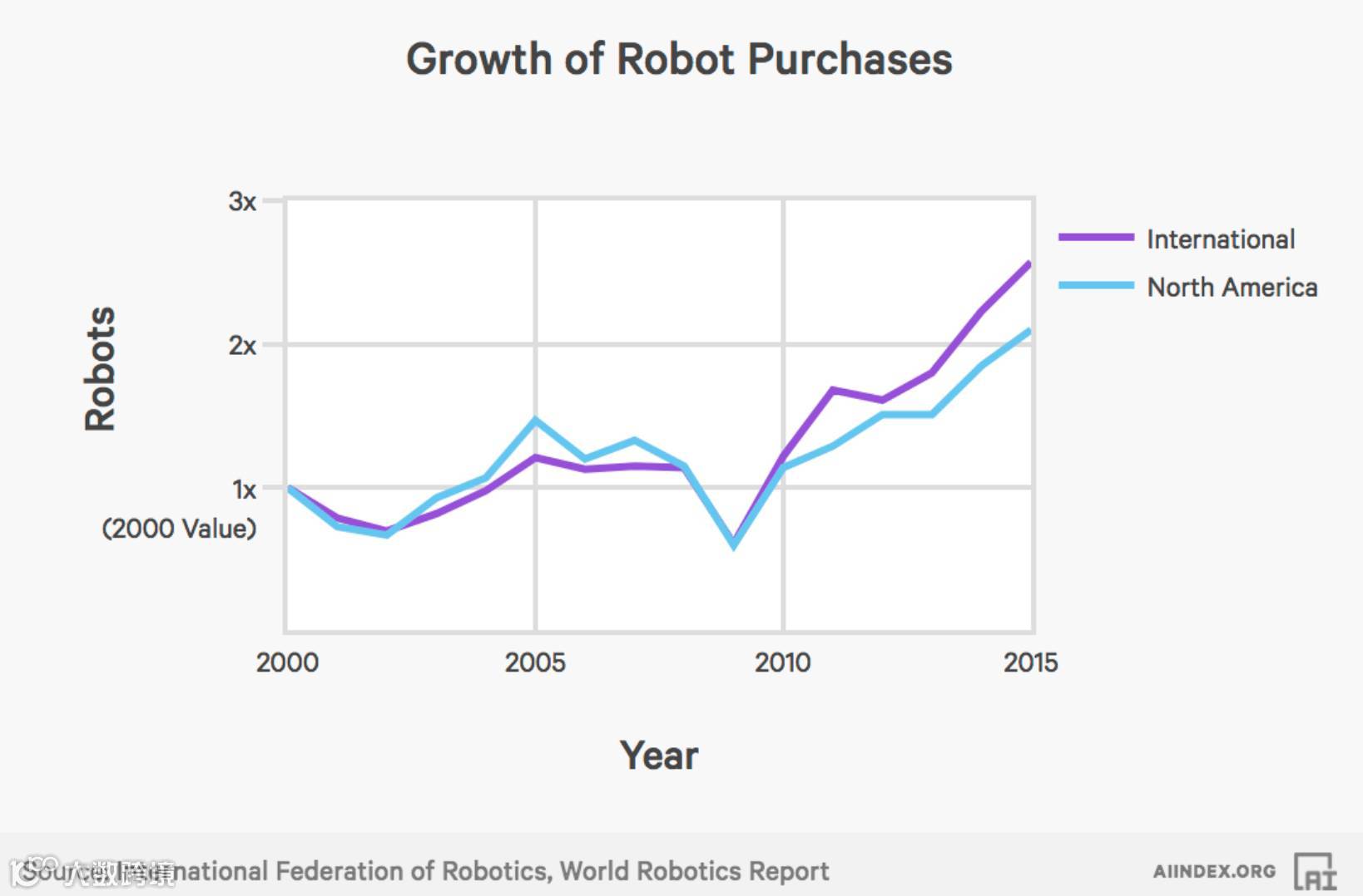 下面是产业自动化的情况。北美和全球的工作机器人购买量在增加。