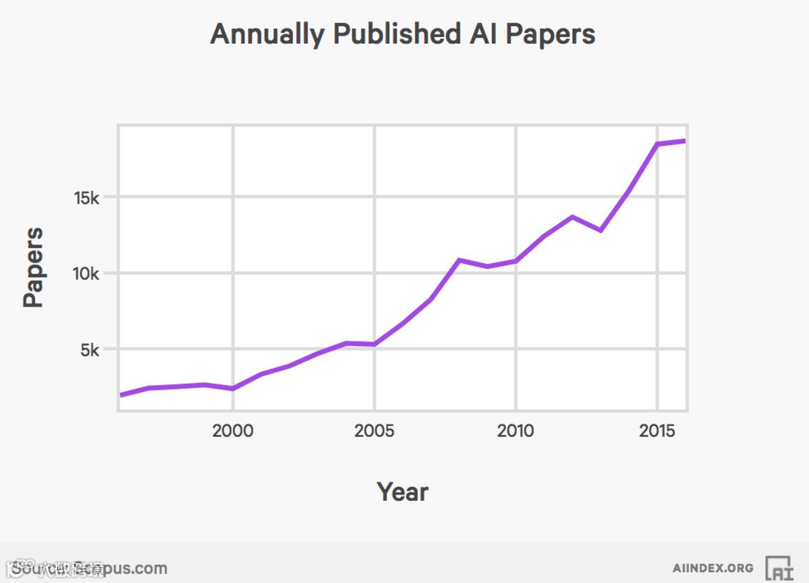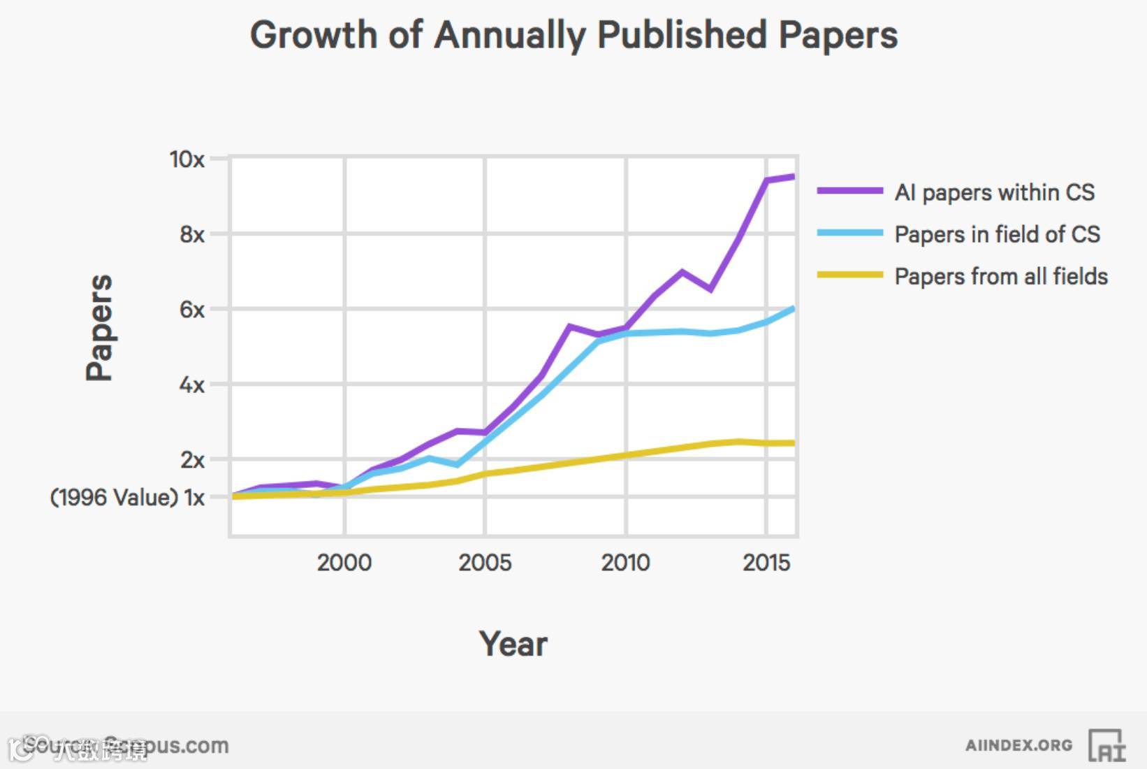 自 1996 年以来,计算机科学领域的论文数量增长了 6 倍,但在同一时期,每年发表的 AI 论文数量增加 了 9 倍。