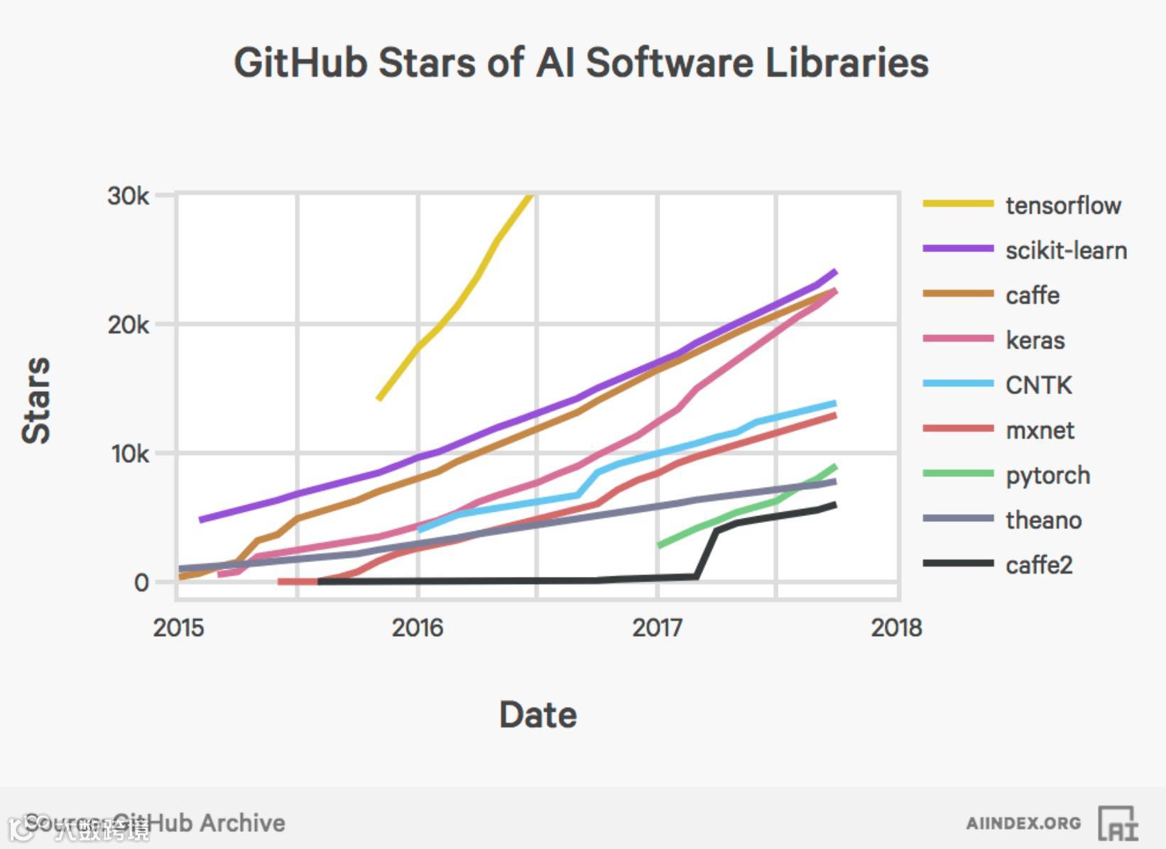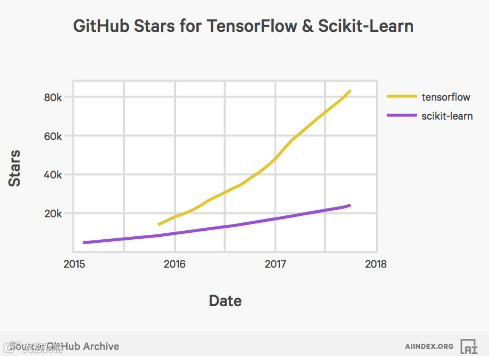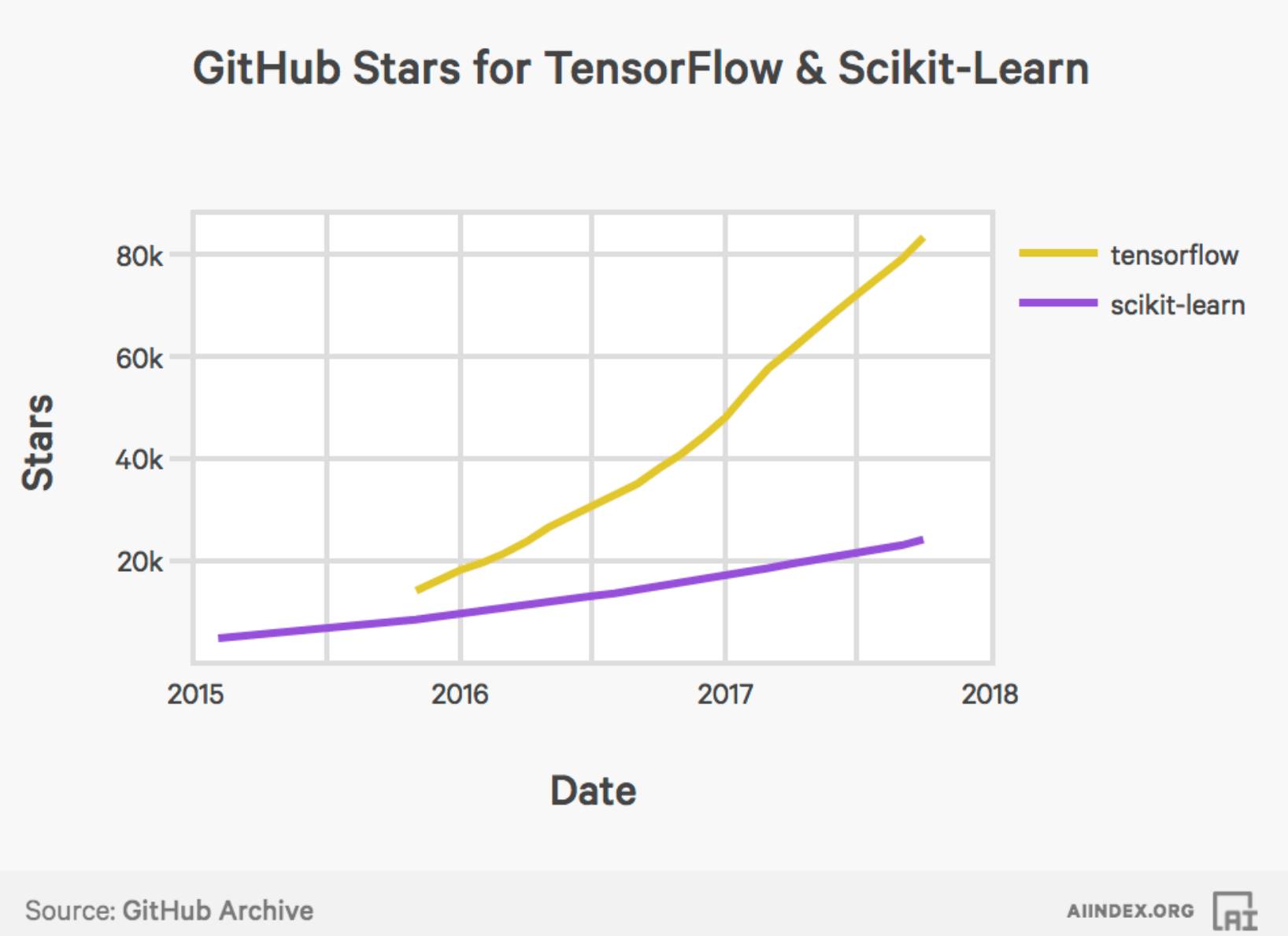 以下是 GitHub 上,TensorFlow 和 Scikit-Learn 软件包获得的星标(star)数量。(TensorFlow 和 Scikit-Learn 是用于进行深度学习和机器学习的热门软件包。)