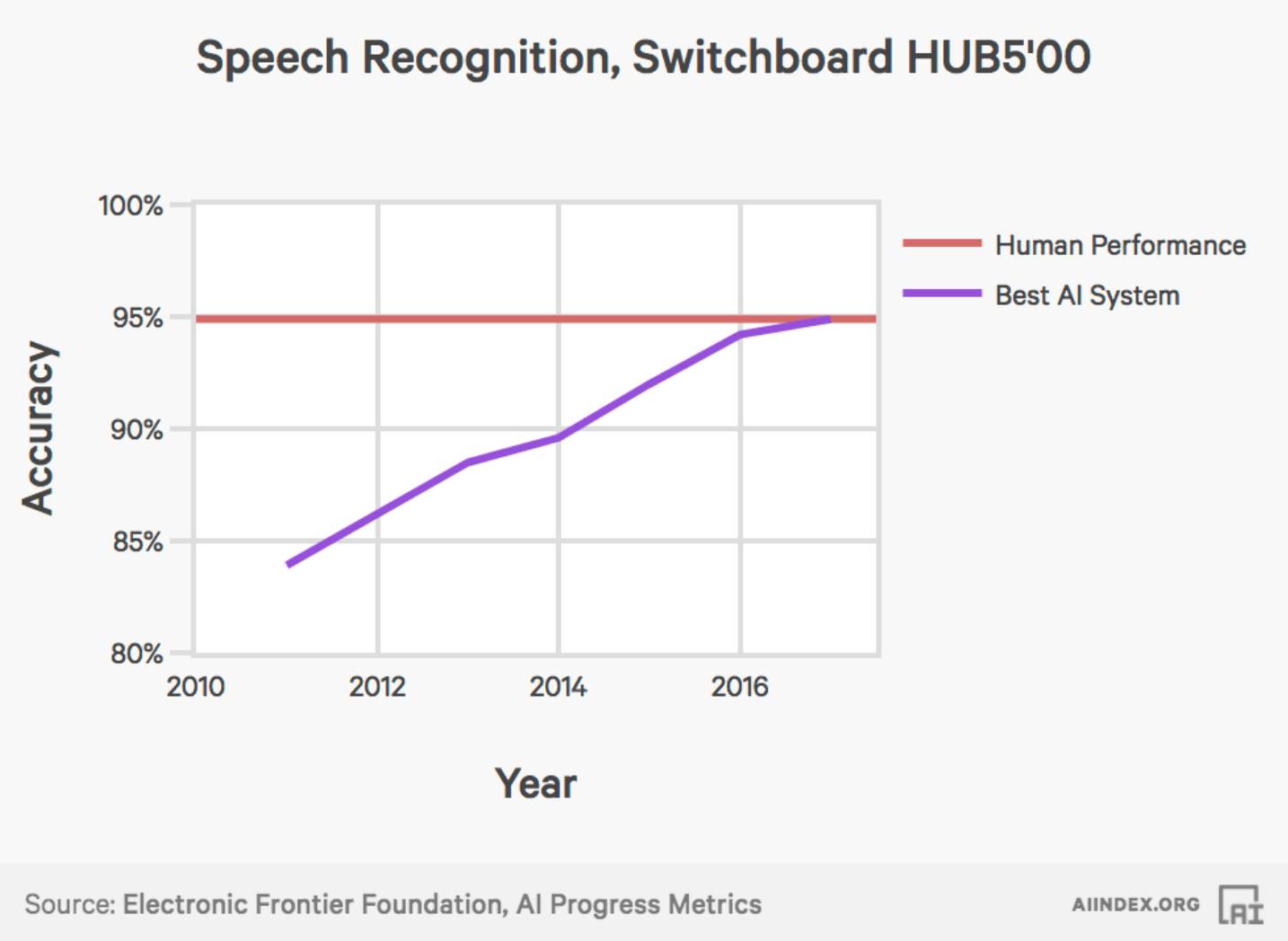 AI 系统在识别语音录音的表现,2016 已经达到人类水平。