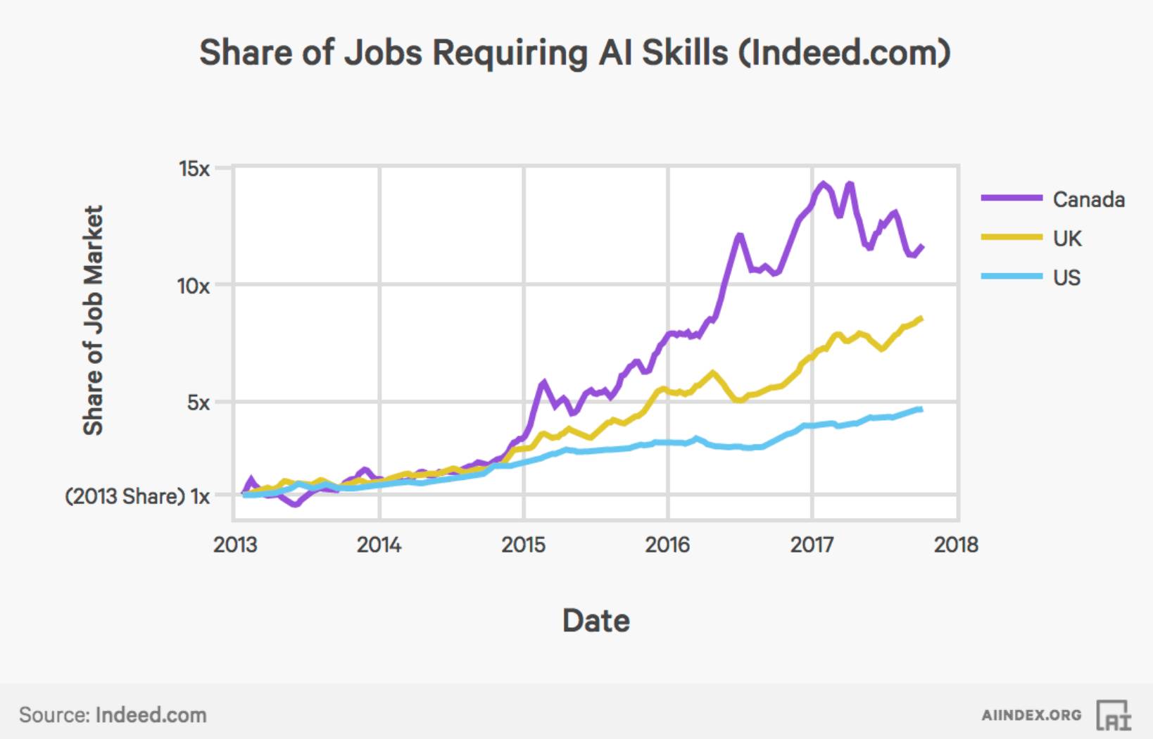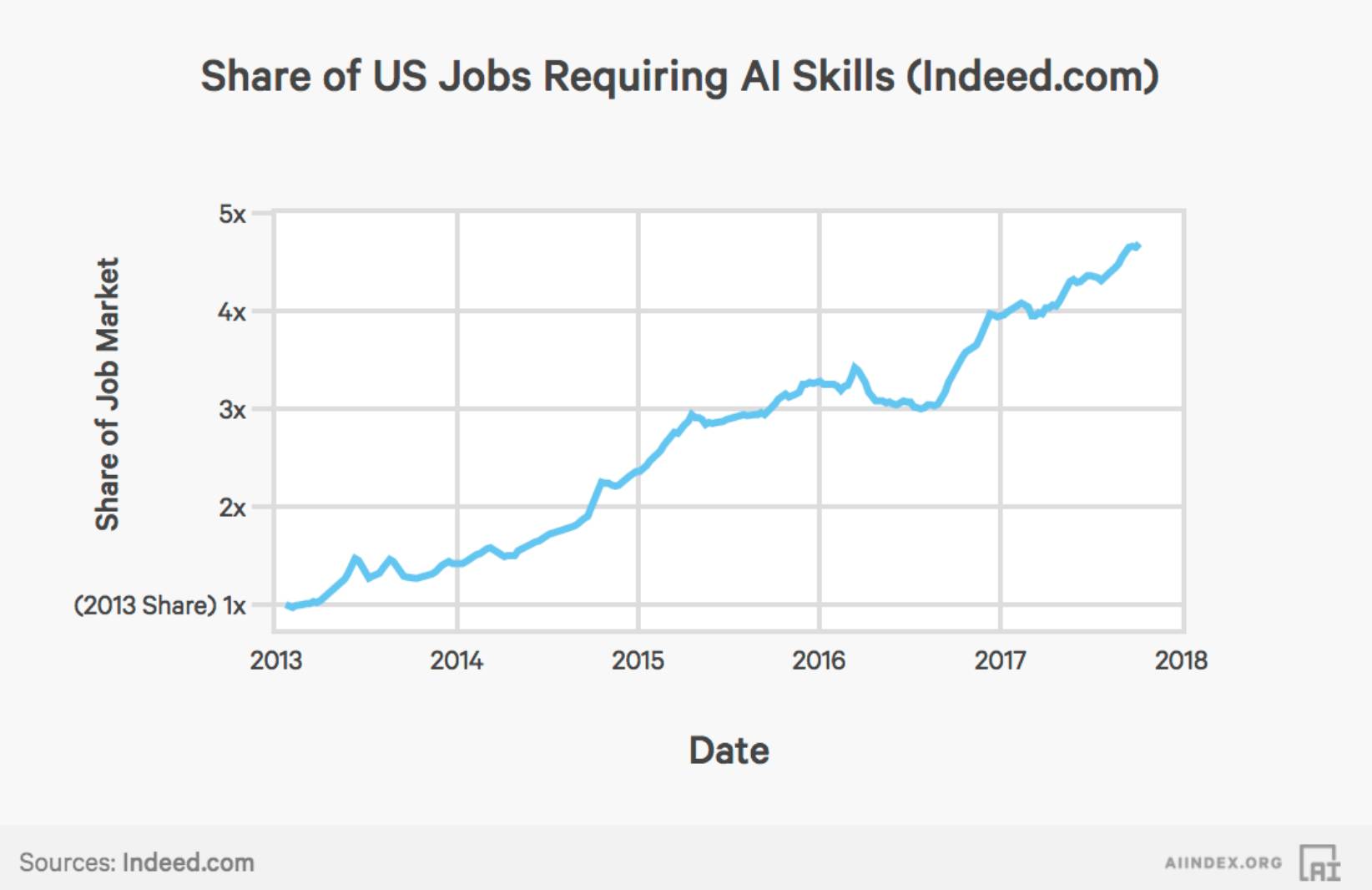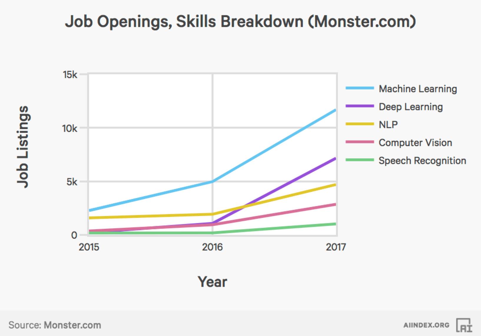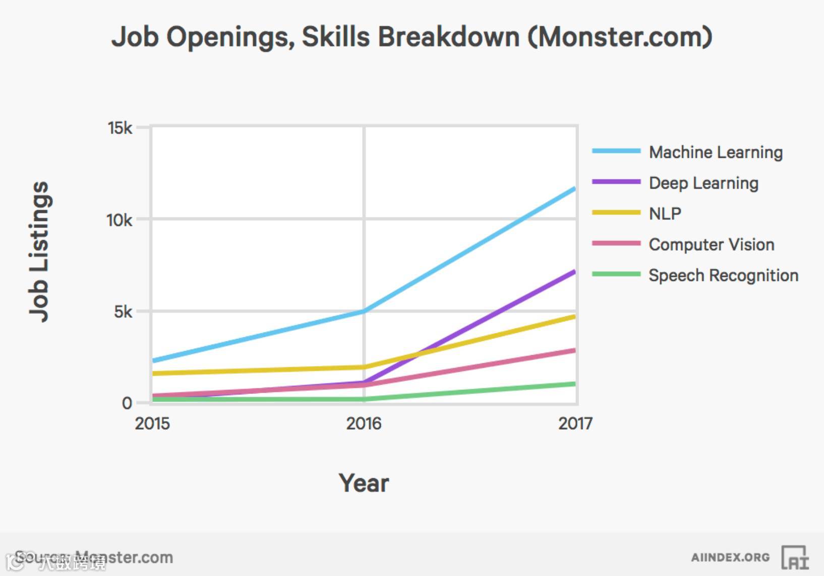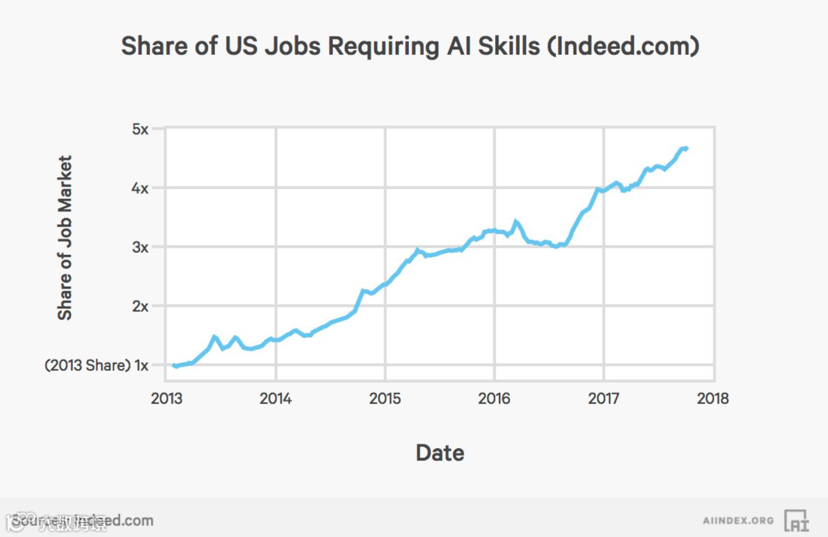 根据两个在线求职平台 Indeed 和 Monster 的数据,AI 相关岗位需求也在增长。自 2013 年以来,在美国需要 AI 技能的工作岗位已经增长了 4.5 倍。