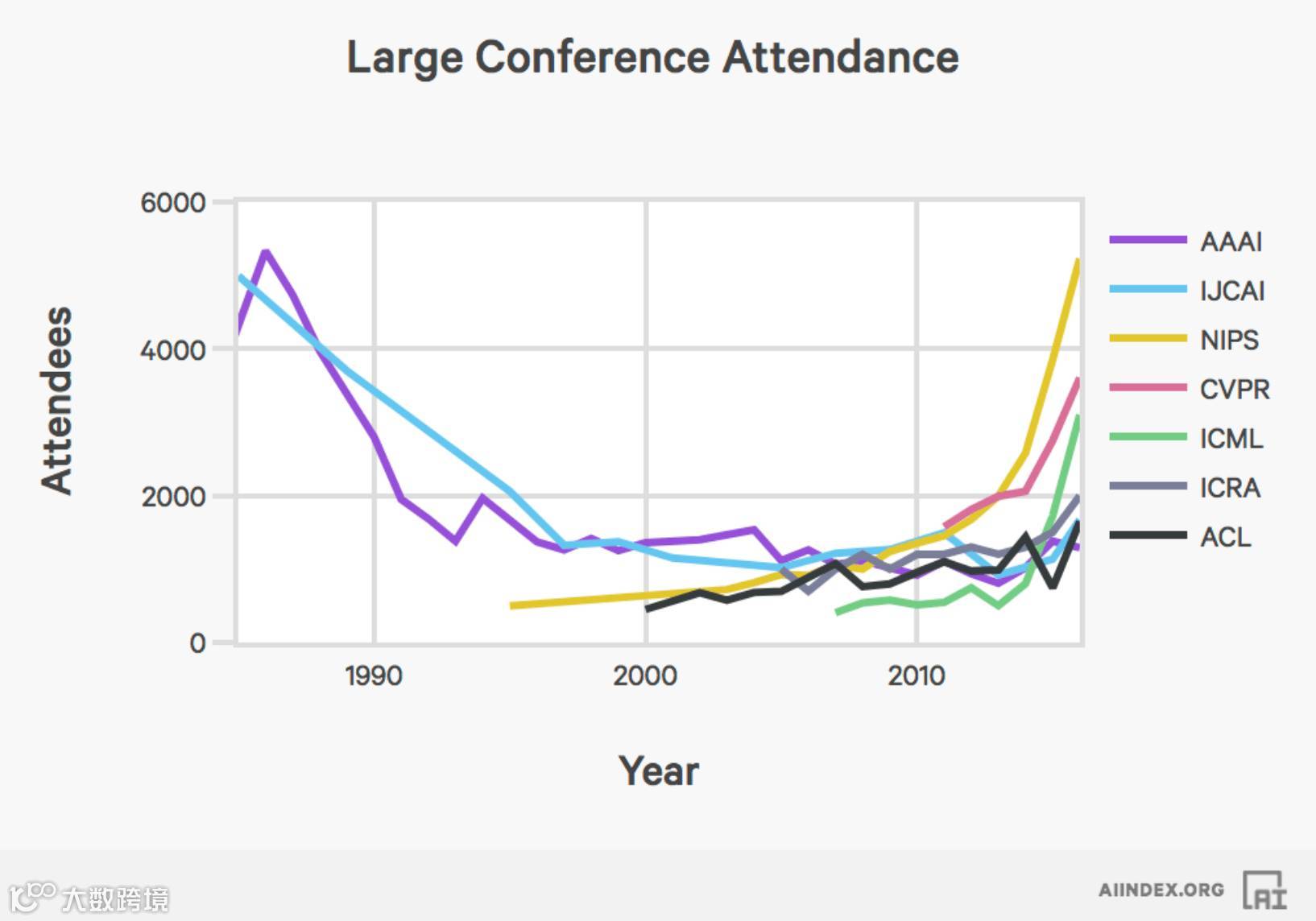 研究重点转移,大型 AI 会议(1000人以上)中,研究重点已经从符号推理转向机器学习和深度学习。