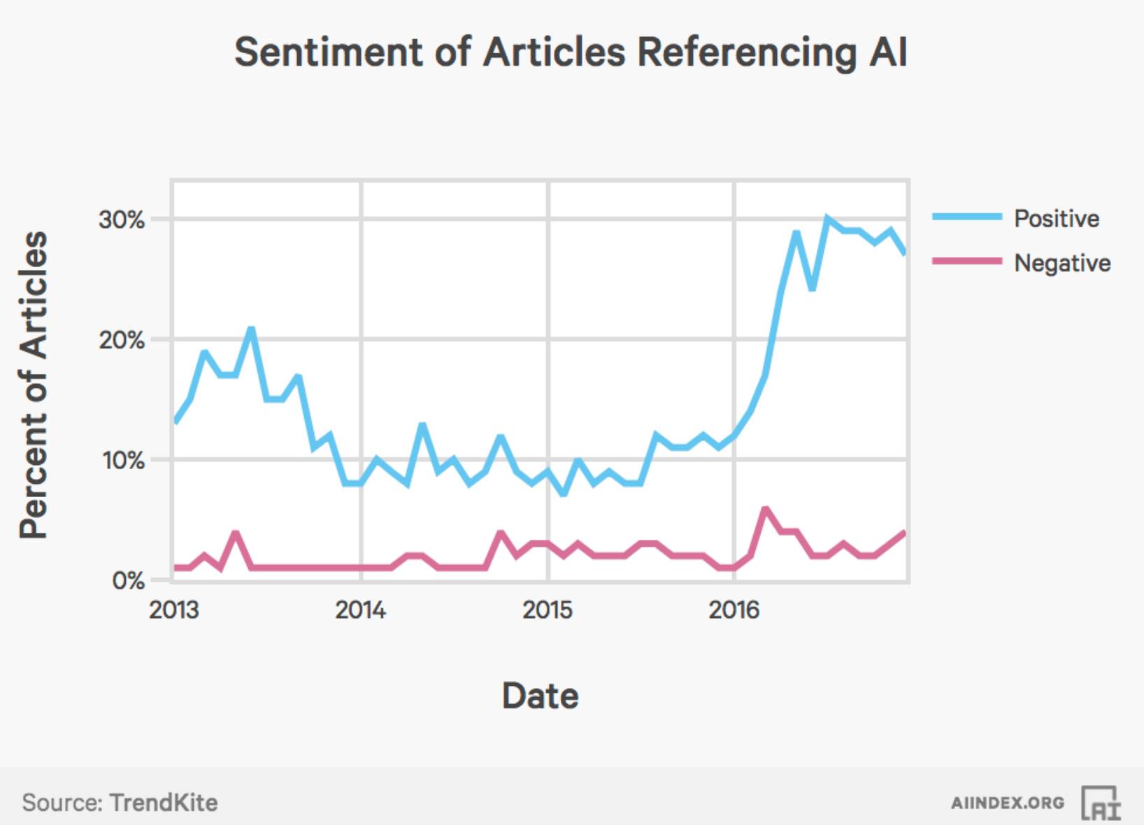 关于 AI 的主流媒体文章报道中,含有正面情绪(蓝线)和负面情绪(紫线)的文章比例。