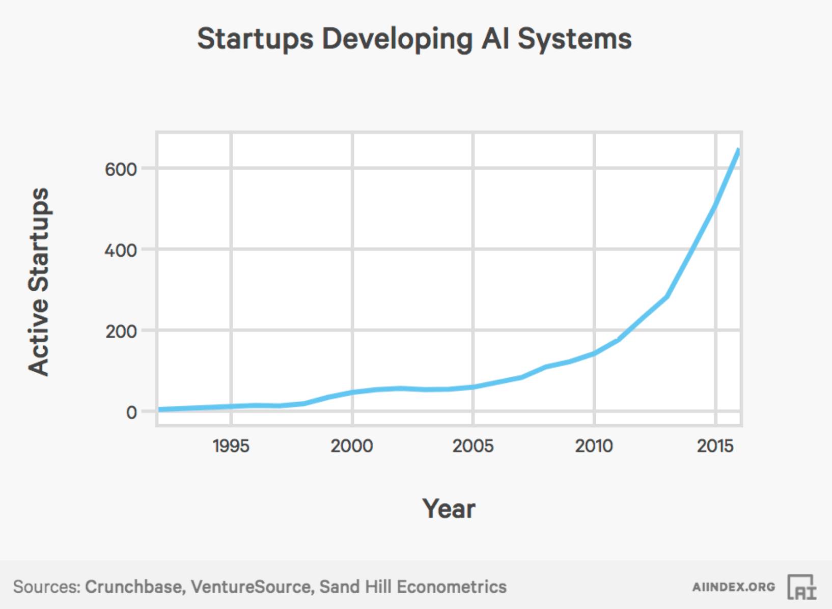 以下为风投资本支持的 AI 创业公司数量。自 2000 年以来,这一数量增加了 14倍。