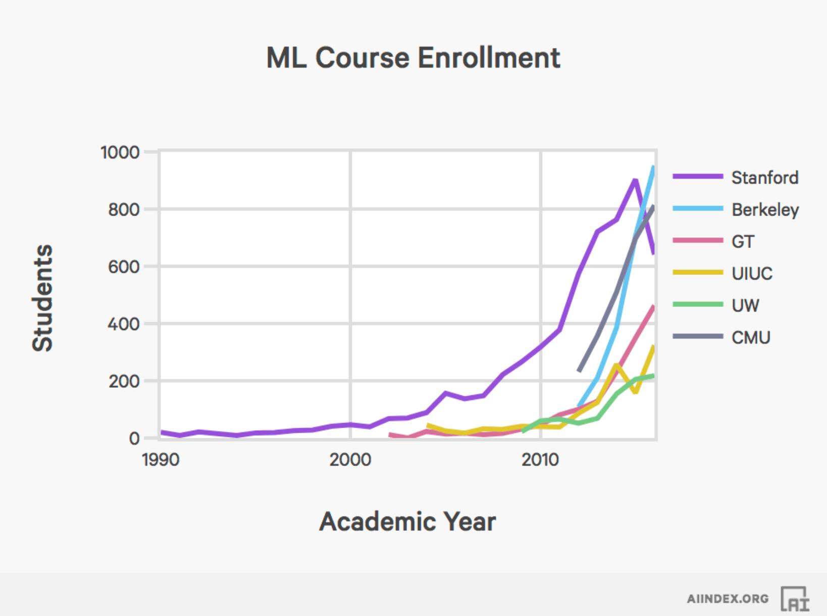 下图为斯坦福大学的 AI 和机器学习课程的选课人数。