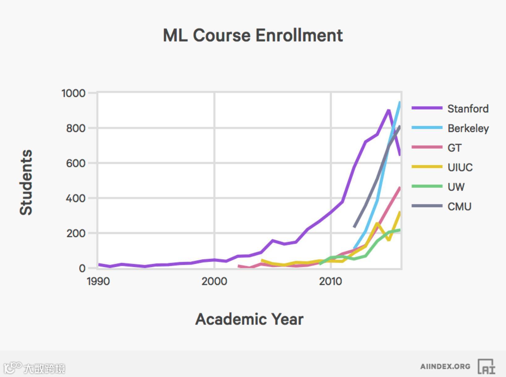 机器学习(ML)是 AI 的一个分支。在这里之所以强调机器学习课程,是因为其选课人数的激增,而且机器学习技术对最近许多 AI 成果至关重要。