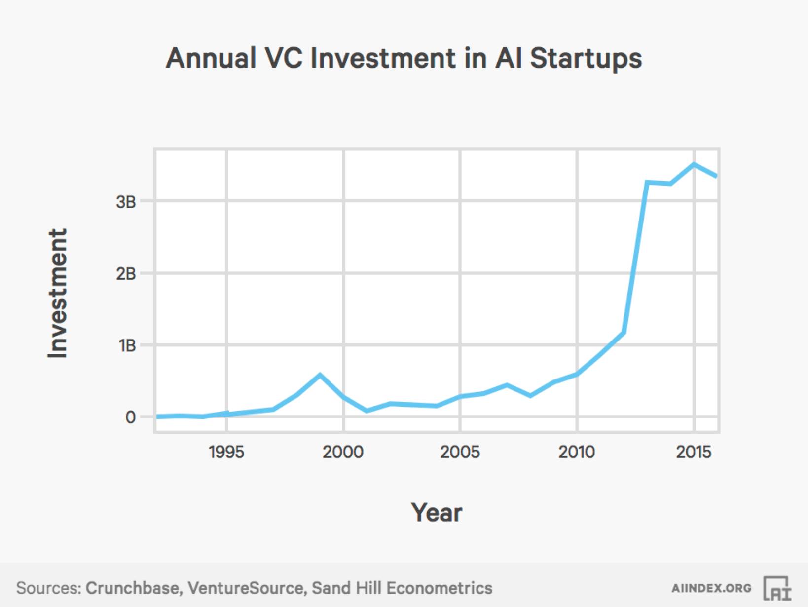 在美国投资 AI 创业的基金数量也在增长,自 2000 年以来,每年投入 AI 创业的资本增加了 6 倍: