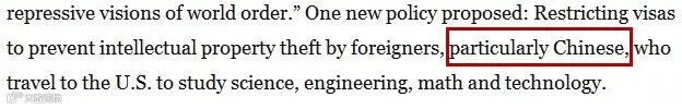 “计划制定新的政策限制签证,以防止外国人(尤其是中国人)来美国学习科学、工程、数学等知识,防止他们盗窃美国的知识产权。”