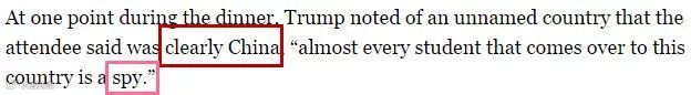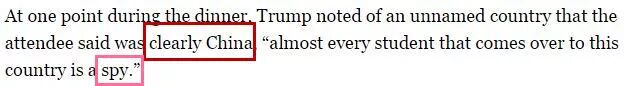 此外川普还提到一个没明说的国家:“almost every student that comes over to this country is a spy.”(几乎每个从这里来的留学生都是间谍)