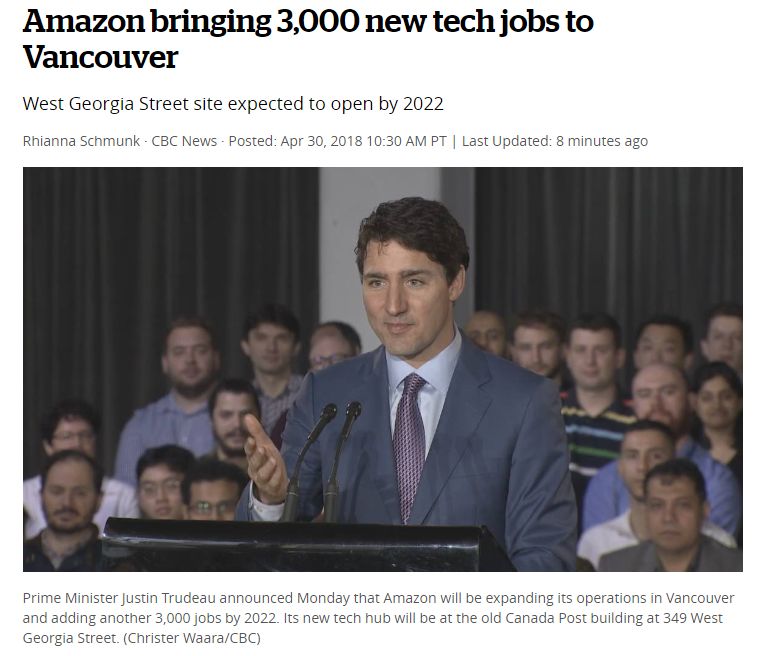 加上亚马逊去年宣布将在2020年开张温市中心另一办公地点、新聘另1000名员工,亚马逊的温哥华员工总数将由当前的1000人左右上升至5000余人。