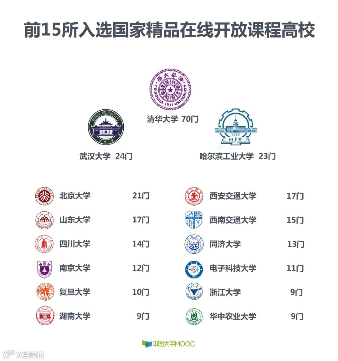 这次入选的490门国家精品课中,清华大学入选70门课程,成为获得最多国家精品在线开放课程的学校,其次为武汉大学(24门),哈尔滨工业大学(23门),北京大学(21门),西安交通大学(17门)。