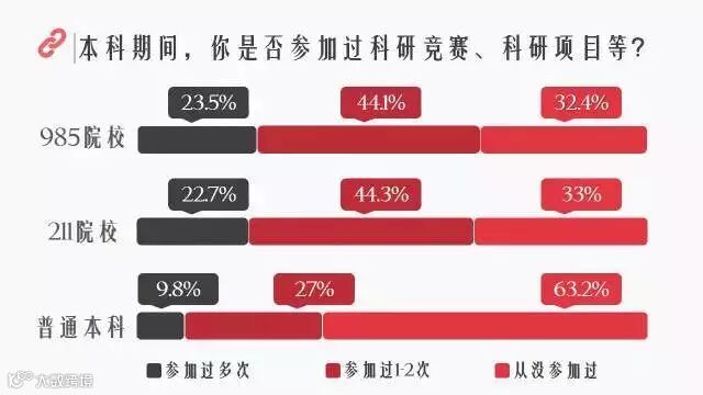 但普通本科高校学生的情况则是:有近三分之二的同学表示从没参加过科研竞赛或项目,有过多次科研类经历的比例只有可怜的不到10%,与他们在985,211高校的同学产生了鲜明的对比。