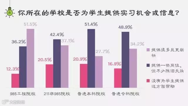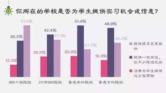 不同水平高校在给学生提供实习机会的问题上表现相差甚远。从985工程高校,211工程院校,再到普通本科院校,能够为学生提供丰富且有效的实习信息及机会的比例依次递减,而普通本科院校在这方面的水平还不如专科。