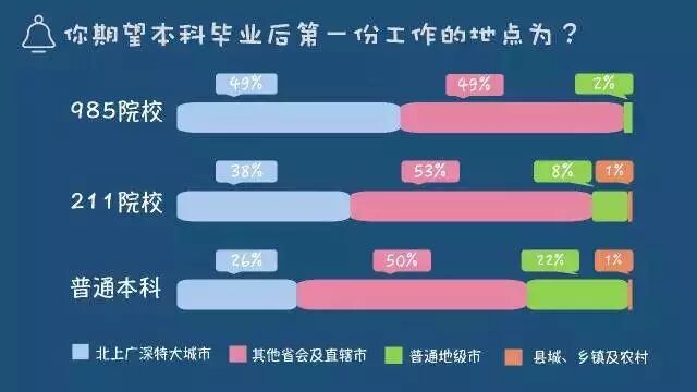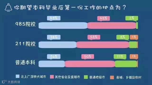 985高校学生中,近50%的人表示自己期望的首份工作地点是北上广深特大城市,而普通本科学生选择这几个一线城市的比例则只有26%;